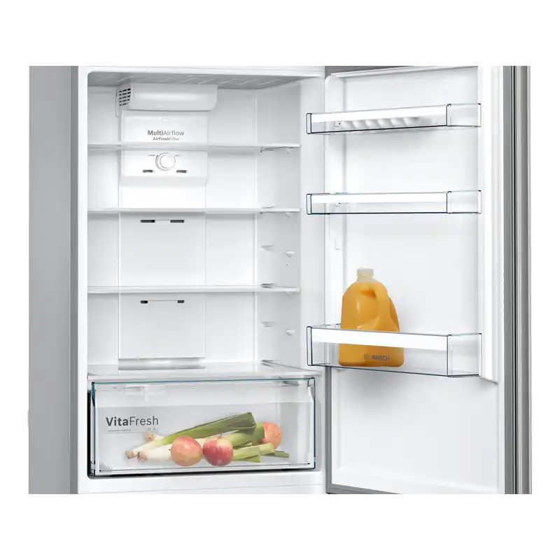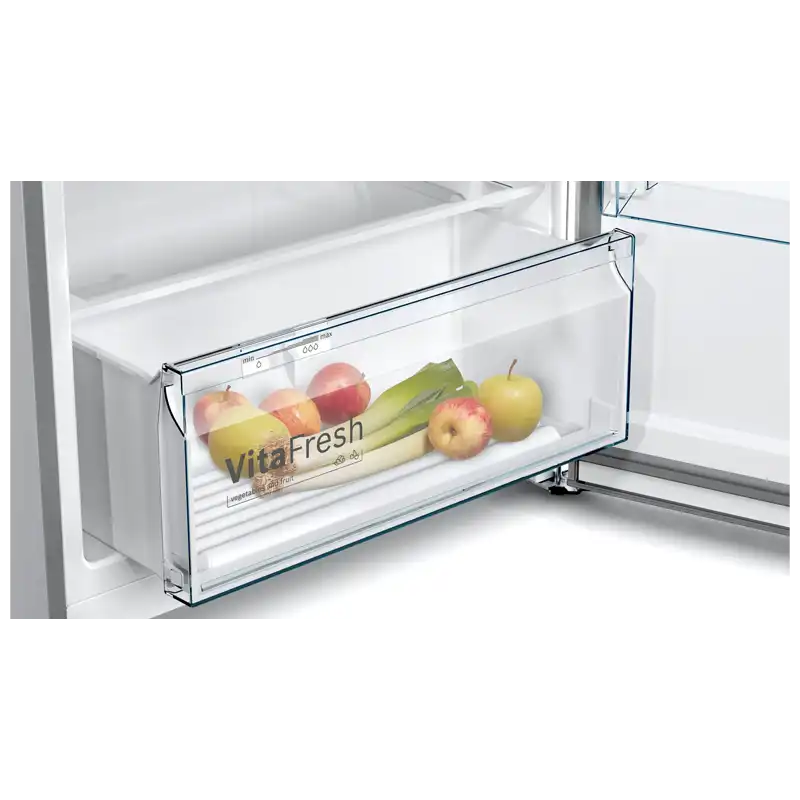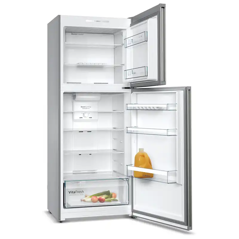 O Frigorífico Bosch 380L Serie 4, revestido em Inox, com congelador superior independente, conta com as seguintes características: