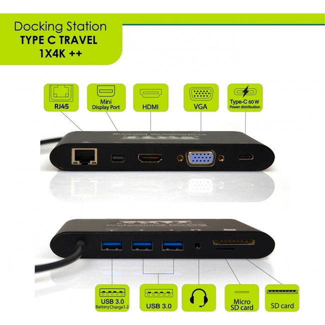 Este dispositivo contém apenas 8 dispositivos: 1 tela (HDMI / Mini Display Port / VGA) / Ethernet / 3 portas USB 3.0 / 2 portas de cartão (SD / MMC e cartão Micro SD) / 1 prêmio de áudio + micro. Ele carrega 1 exibição de vídeo adicional, com 3 interfaces possíveis: HDMI ou Mini Display Port ou VGA.