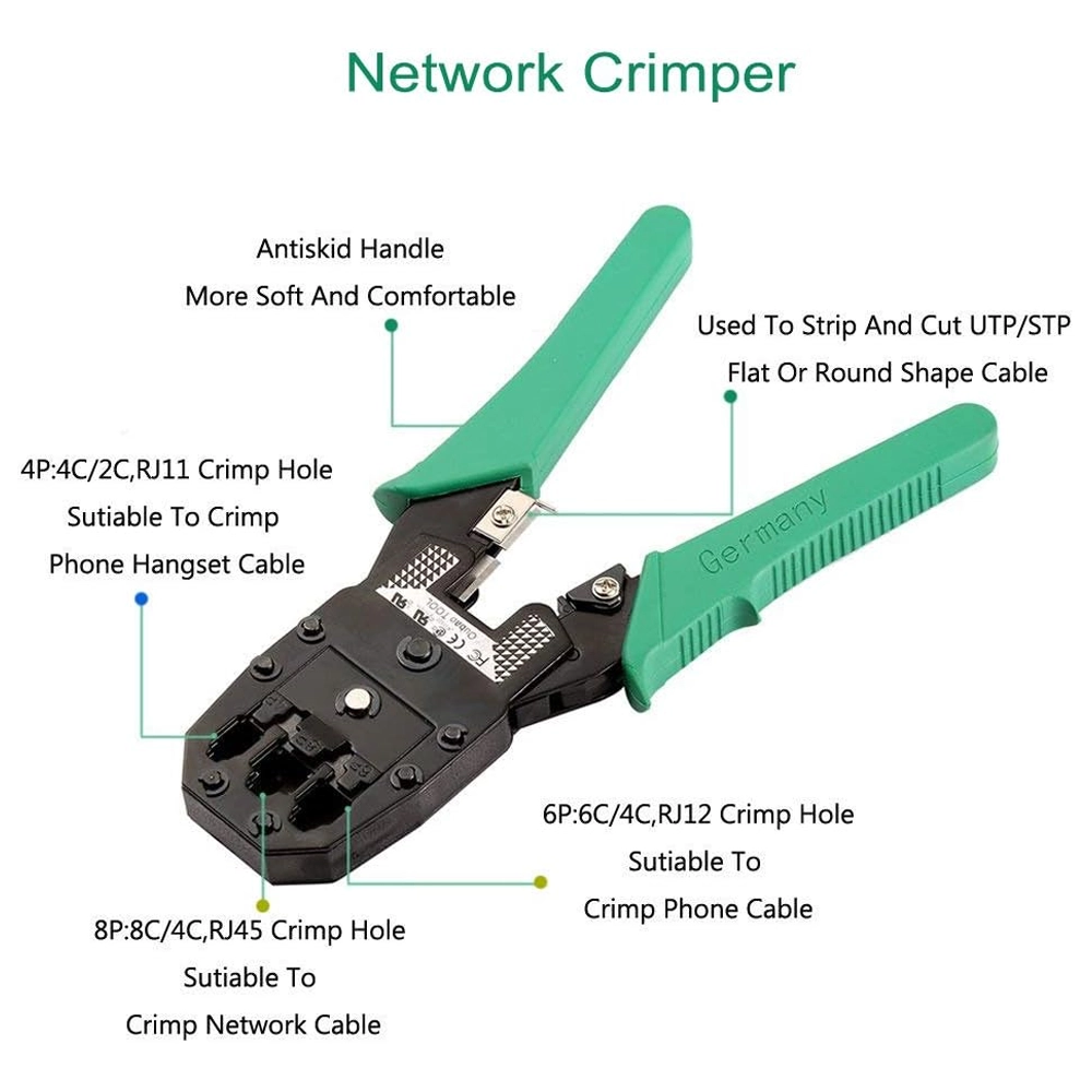 - Alicate de Crimpagem Multifunções: Compatível com conectores 8P8C (RJ45), 6P6C (RJ12) e 4P4C (RJ11).