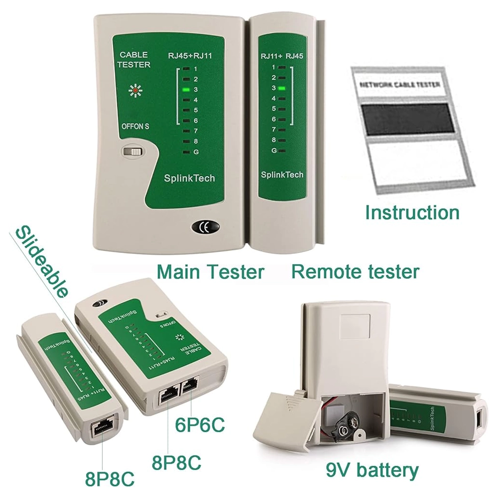 - Testador de Cabos Dual-Mode: Verifica cabos RJ45 (rede) e RJ11 (telefone) com modo de varrimento automático e manual.