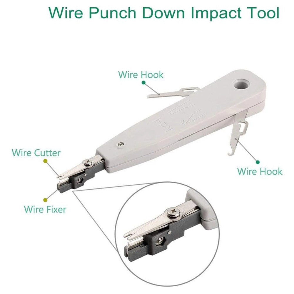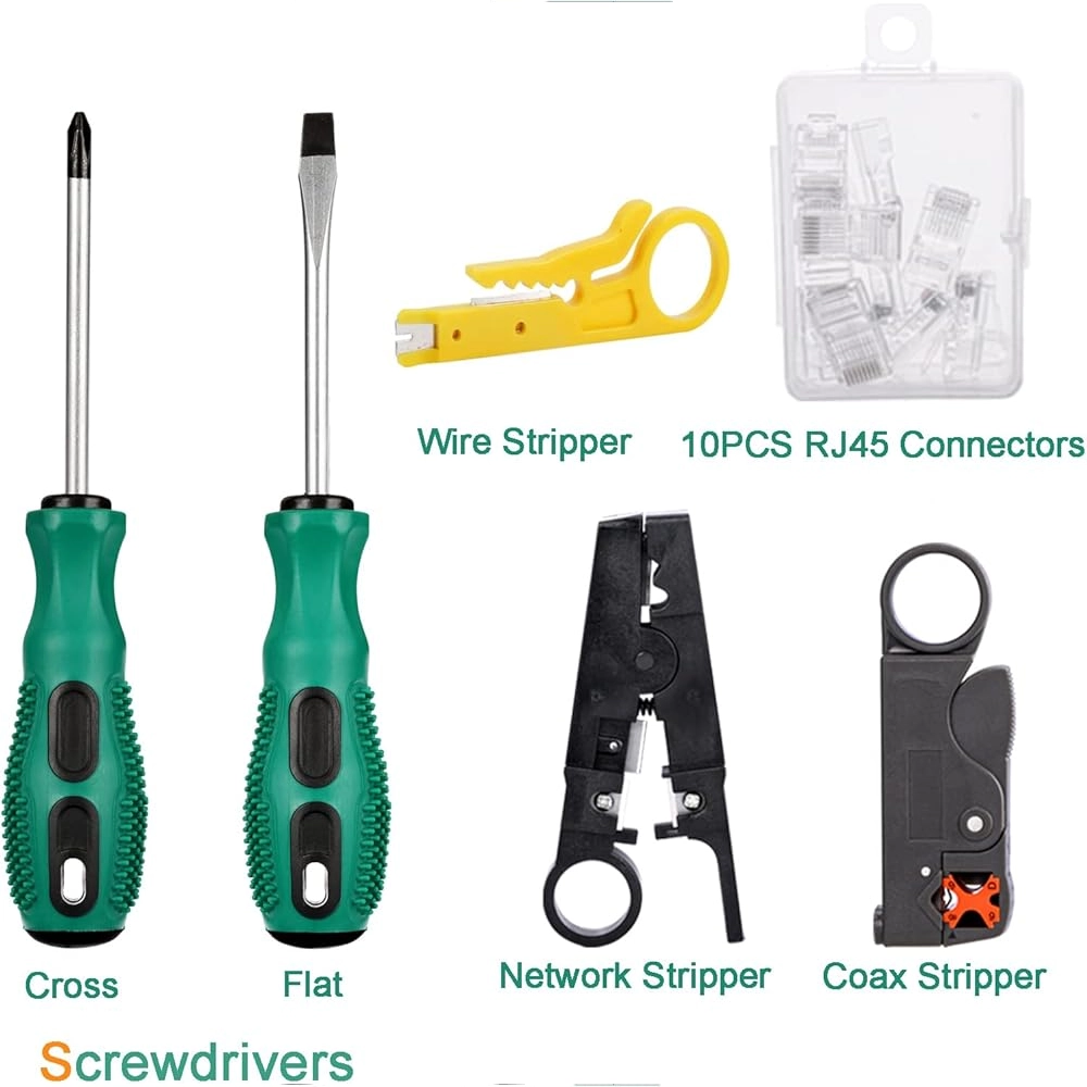 Este Kit de Ferramentas de 9 Peças foi concebido para oferecer todas as ferramentas necessárias para a criação, reparação e teste de cabos de rede (Ethernet) e de telefone. Seja para passar cabos CAT5e, CAT6 ou CAT7, este conjunto permite-lhe cravar fichas, descarnar isolamentos e verificar a continuidade do sinal de forma profissional.