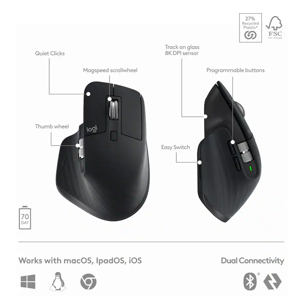 O MX Master 3S (incluído no combo) é um rato ergonómico desenhado para profissionais: