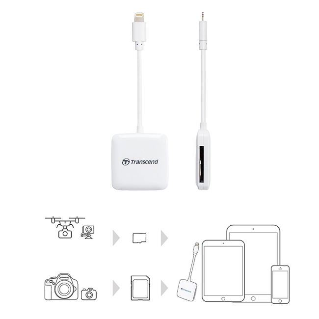 Transfira arquivos de e para cartões de memória SD e microSD usando o leitor de cartão de memória TS-RDA2W com conector Lightning da Transcend. Este leitor inteligente com certificação MFi possui um conector Lightning projetado para suportar dispositivos iPhone, iPad e iPod equipados com a porta Lightning.