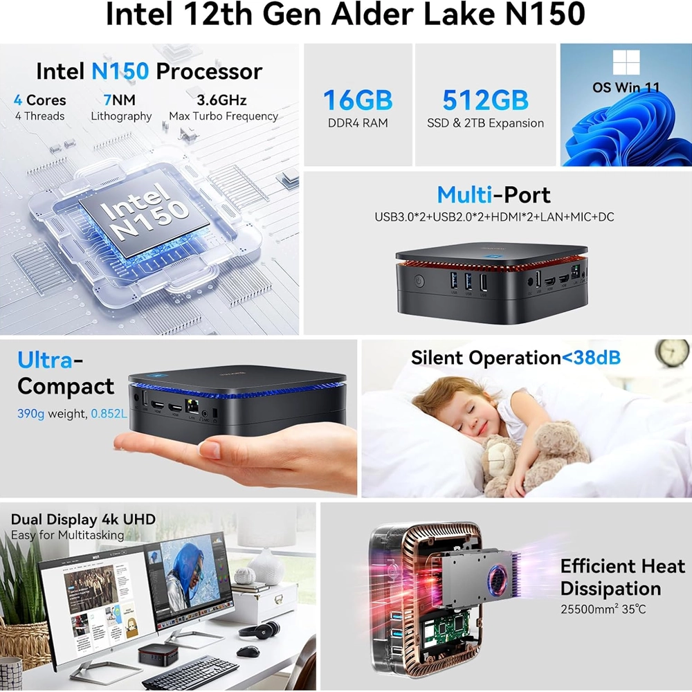 • 16 GB de RAM Rápida: Permite Multitarefa Otimizada. Uma grande capacidade de memória para um Mini PC de entrada, que permite navegar com múltiplas abas abertas e executar vários programas de escritório simultaneamente sem lentidão.