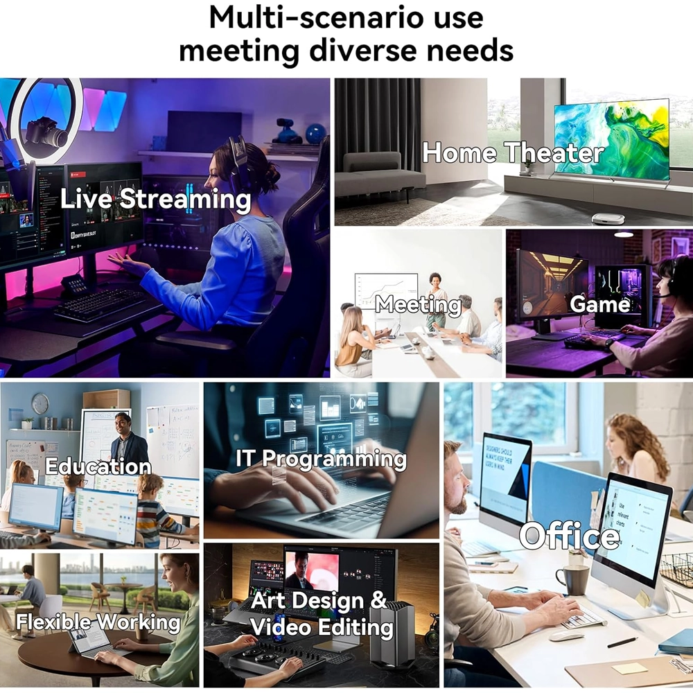 • Múltiplas Saídas de Vídeo: Suporte para dois ecrãs (geralmente via HDMI), tornando-o adequado para ambientes de trabalho que exigem visualização em mais de um monitor.