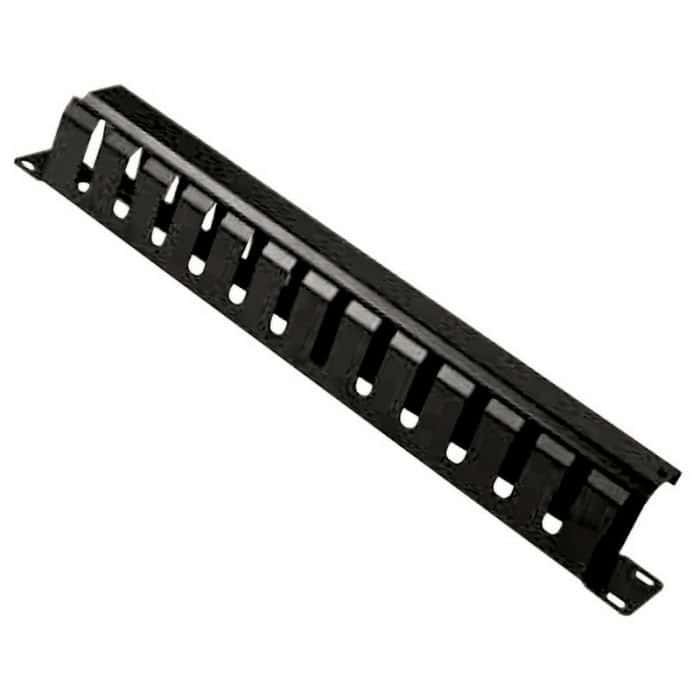 Painel guia de cabos horizontal padrão 19″, 1u, com furação suaves que protege a entrada ou saída dos cabo. – Cor RAL 9005 (preto) – Dimensões 483x44mm”