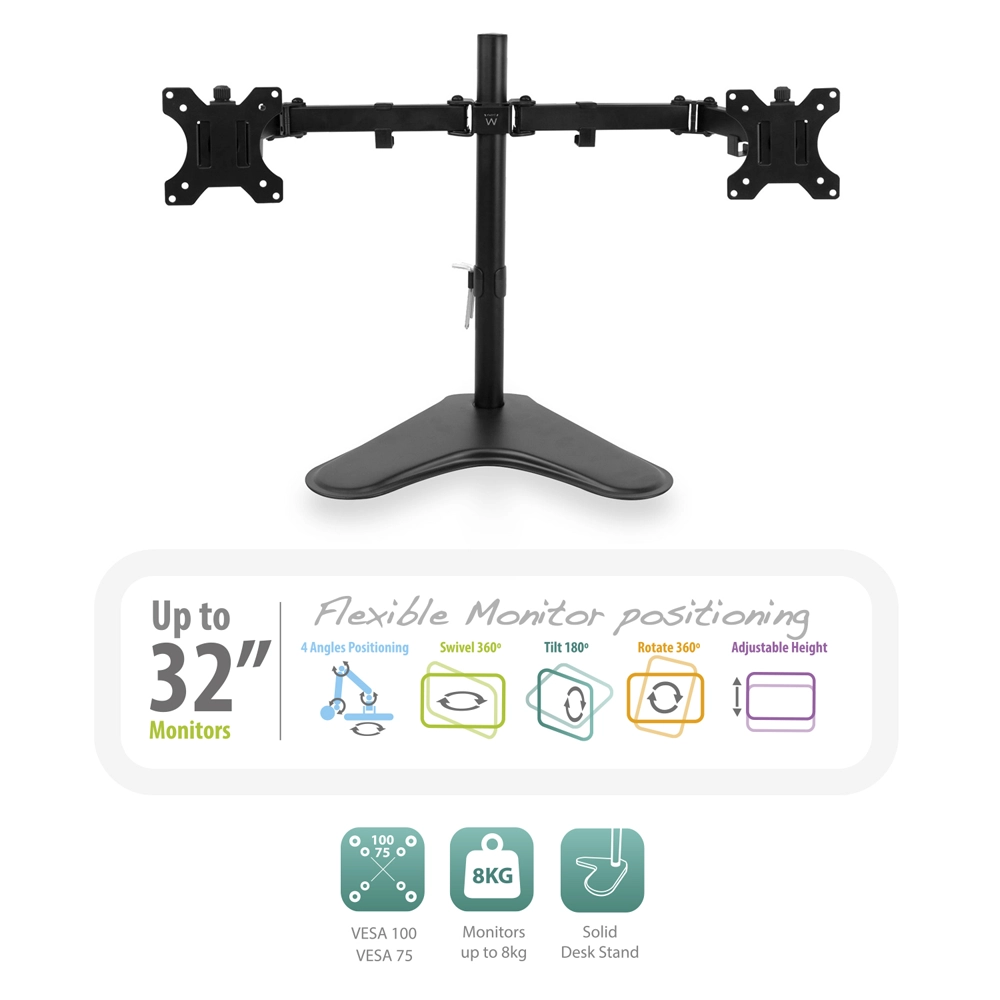 - Ampla Compatibilidade: Ideal para a maioria dos ecrãs de 13″ até 32″ e suporta um peso máximo de 8 kg por monitor.