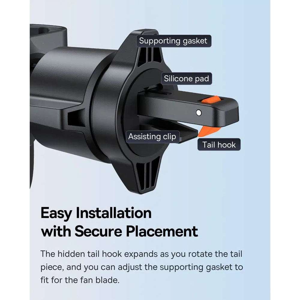 O design compacto e inteligente foi feito para ser instalado na grelha de ventilação do seu carro. Esta posição discreta não obstrui a sua visão da estrada e garante que o telemóvel esteja sempre ao alcance para navegação ou chamadas, sem interferir com o fluxo de ar.