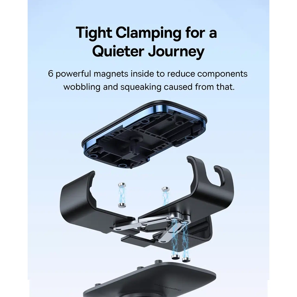 A tecnologia de gravidade automática torna o uso deste suporte incrivelmente fácil e rápido. Basta colocar o seu smartphone na base do suporte e o seu próprio peso acionará as pinças laterais, fixando o dispositivo de forma firme e segura em segundos, com apenas uma mão.