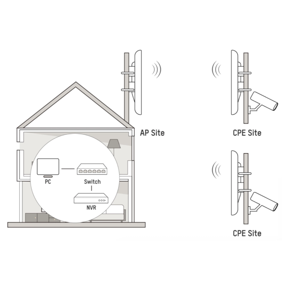 O kit inclui duas unidades pré-emparelhadas, permitindo instalação rápida no modo Ponto-a-Ponto (PtP) ou Ponto-a-Multiponto (PtMP), sendo ideal para enlaces de dados, câmeras IP e expansão de redes sem necessidade de cabos.