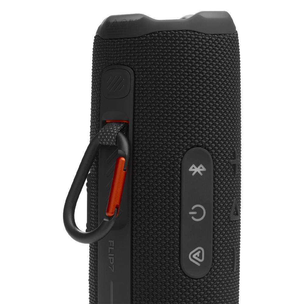Além disso, o Flip 7 utiliza Auracast™ para emparelhamento com outros alto-falantes habilitados, ideal para criar um ambiente estéreo ou expandir o som para múltiplos ambientes. Seu sistema de acessórios PushLock permite personalizar o transporte com clip ou alça, tornando-o prático para qualquer aventura. Também é compatível com áudio lossless via USB-C, ideal para ouvir com a máxima qualidade.