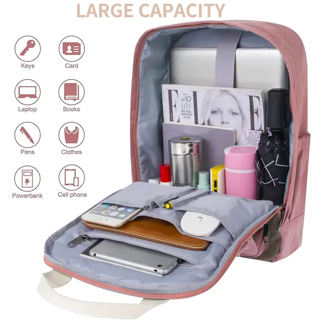 Feita para Mulheres, a Mochila Para Computador tem 2 compartimentos principais grandes e 6 bolsos internos pequenos, 2 bolsos frontais com zíper e 2 bolsos laterais. O compartimento para laptop desta mochila para laptop pode acomodar um laptop de 15,6 polegadas e vários bolsos pequenos podem acomodar um telefone, canetas e outros itens pequenos. Nossa mochila estética é muito conveniente para o seu dia a dia.