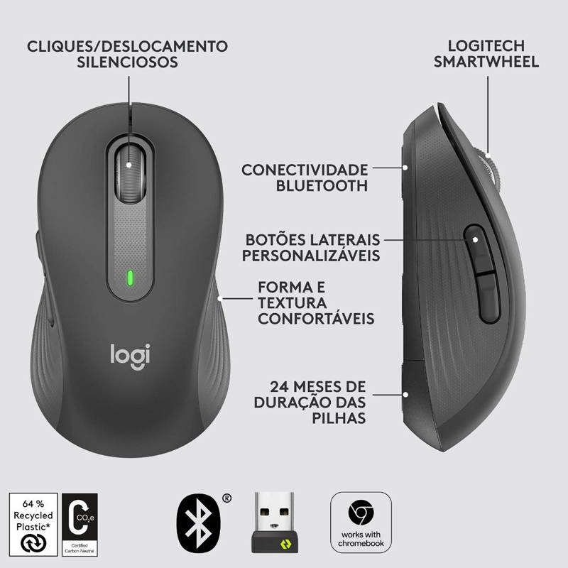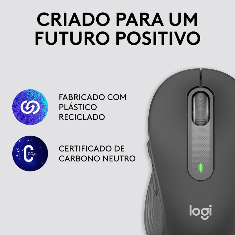 - As partes de plástico no Logitech Signature M650 incluem plástico pós-consumo reciclado com certificação ( Plásticos no Grafite/Preto: 64%, Branco Fosco/Cor-de-rosa: 26%****)